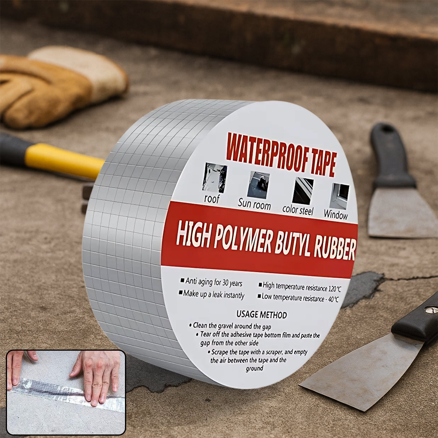 Material: High polymer butyl rubber with protective aluminum foil backing